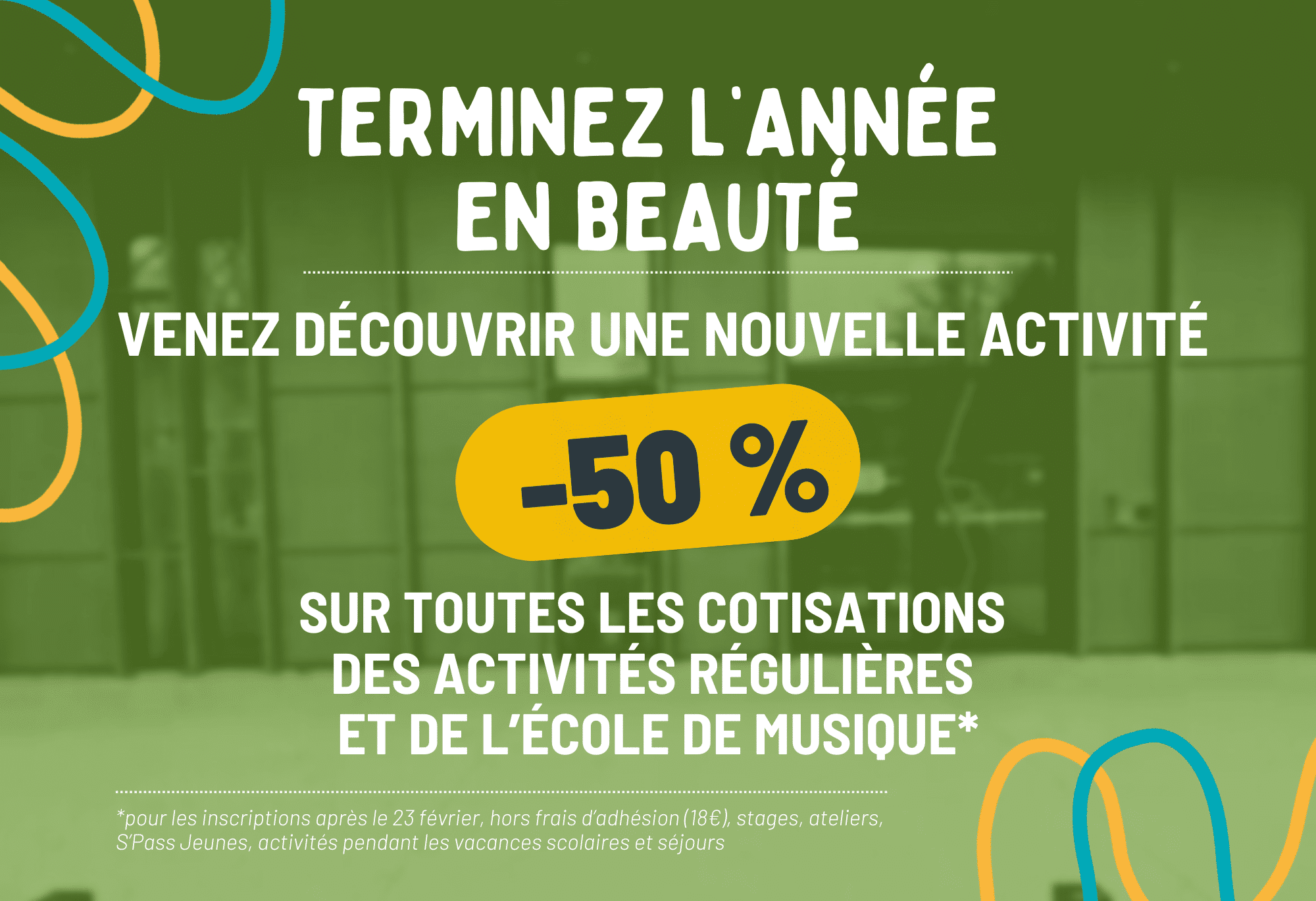 Pour bien finir l’année, profitez de -50 % sur toutes les inscriptions à une activité régulière ou à l’école de musique*. Une occasion idéale pour découvrir une nouvelle passion, progresser dans vos cours préférés ou rejoindre nos ateliers musicaux.