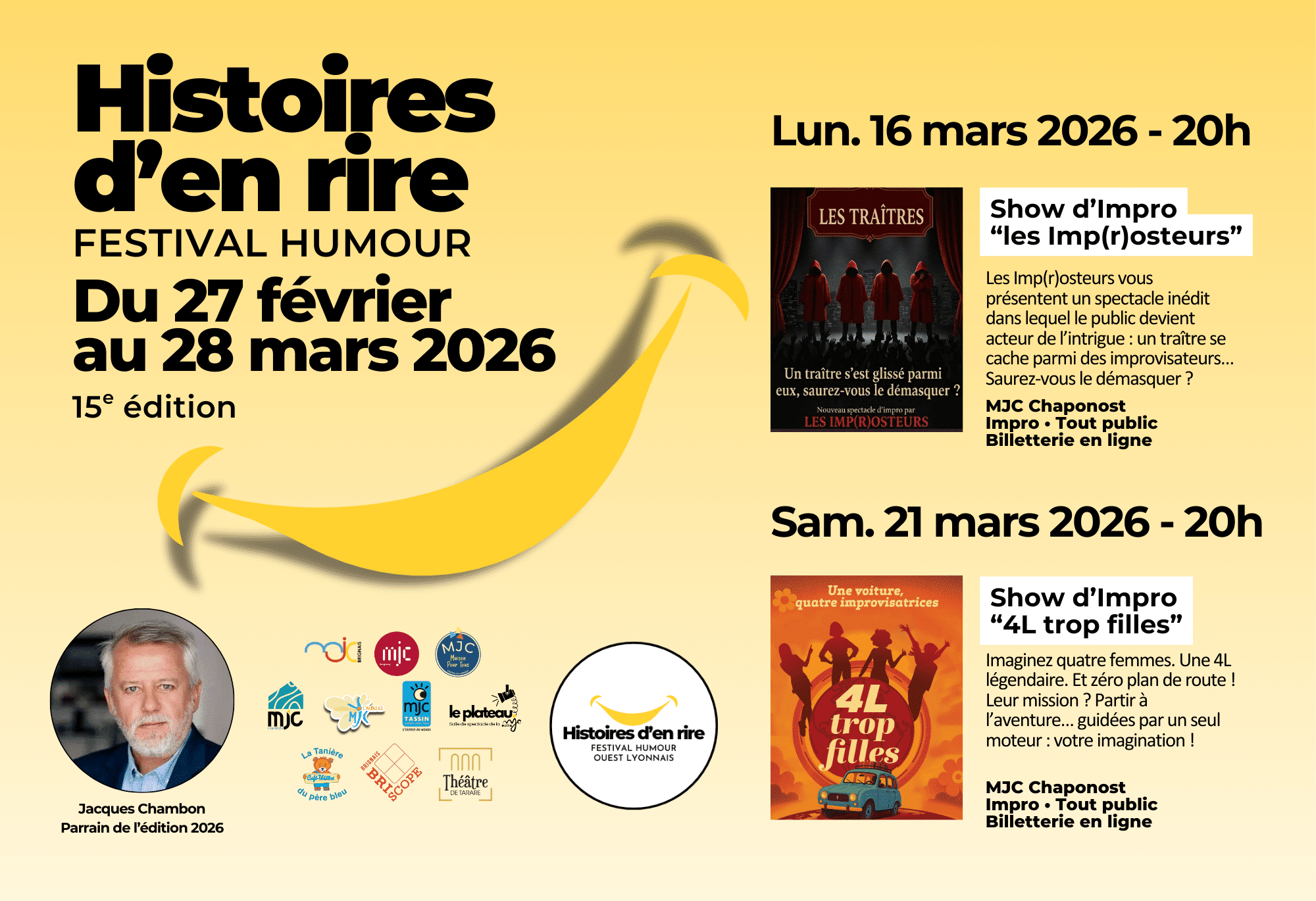 Depuis 2011, le festival Histoires d’en rire réunit les acteurs du spectacle vivant de l’Ouest lyonnais autour d’une programmation humoristique sur plusieurs semaines, mêlant artistes professionnels et amateurs.