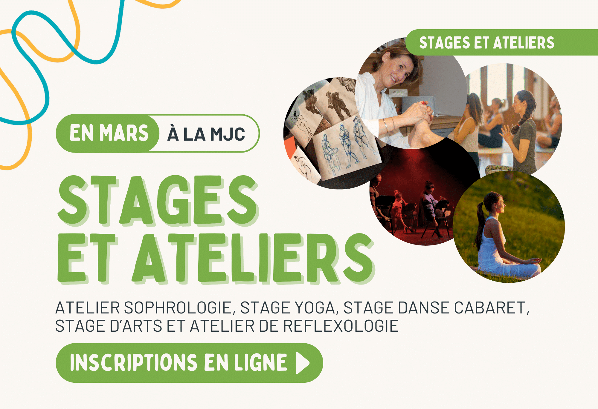 Découvrez tous les stages et ateliers de la MJC du mois de mars : sophrologie, réflexologie, yoga, danse cabaret et atelier modèle vivant (nu·e). Des temps de pratique et de découverte ouverts à toutes et tous.