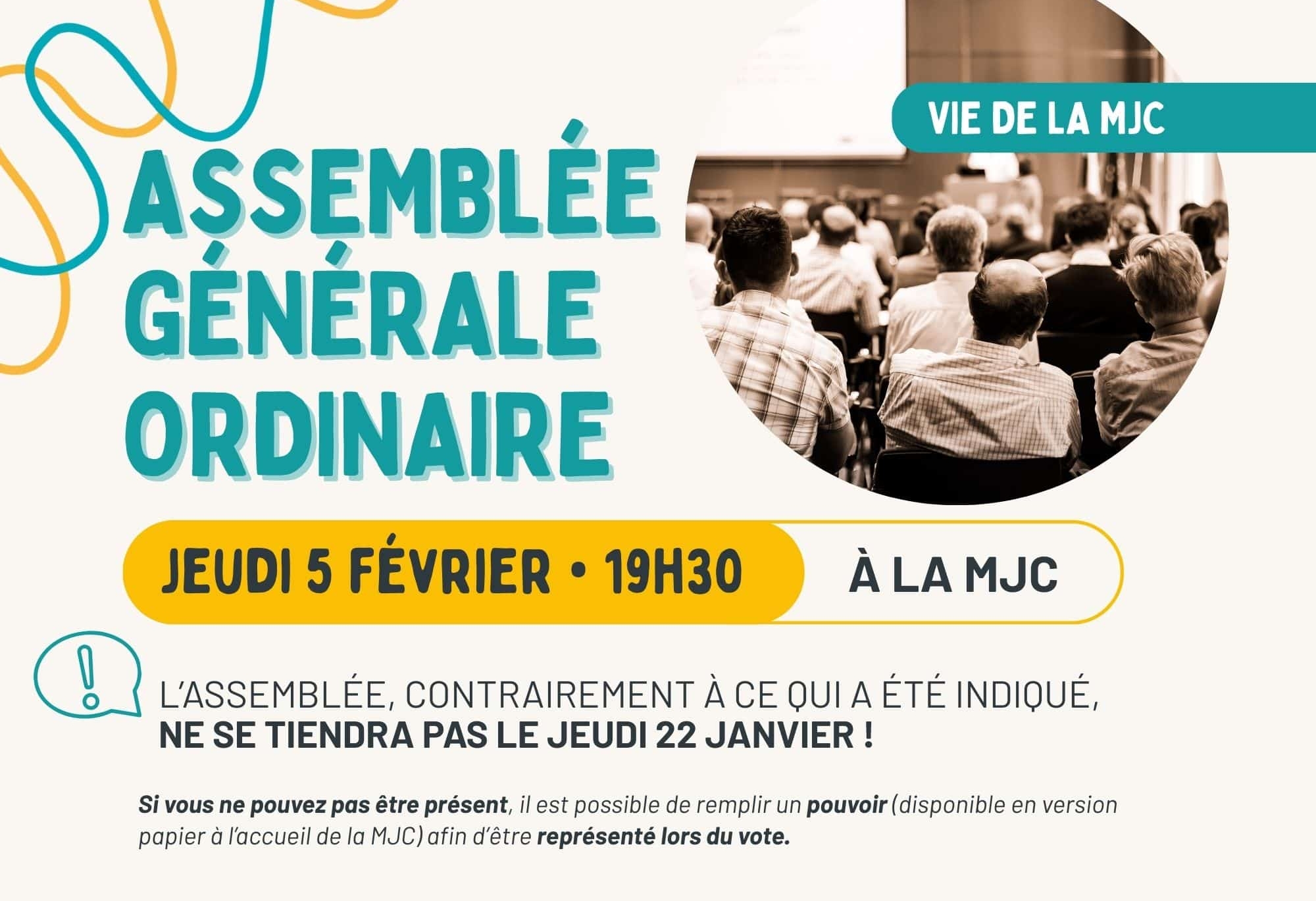 L’Assemblée Générale Ordinaire de la MJC se tiendra jeudi 5 février à 19h30, à la MJC.